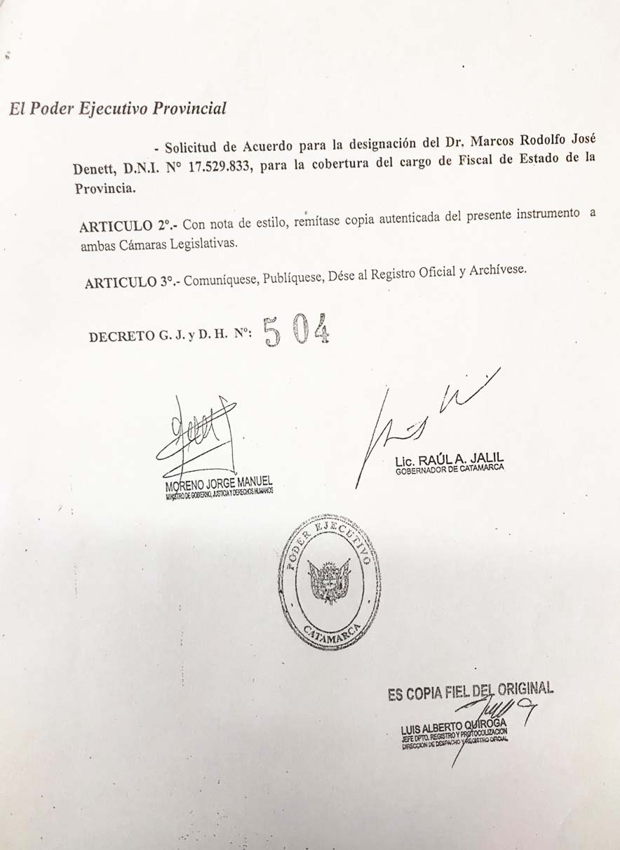 *Solicitud de Acuerdo para la designación del Dr. Marcos Rodolfo José Denett, D.N.I. N° 17.529.833, para la cobertura del cargo de Fiscal de Estado de la Provincia.