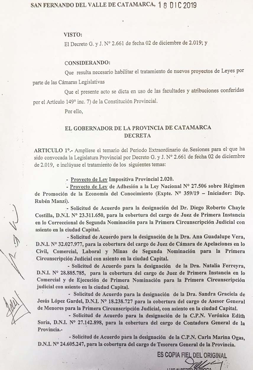*Solicitud de Acuerdo para la designación del Dr. Diego Roberto Chayle Costilla, D.N.I. N°23.311.650, para la cobertura del cargo de Juez de Primera Instancia en lo Correccional de Segunda Nominación para la Primera Circunscripción Judicial con asiento en la ciudad Capital.