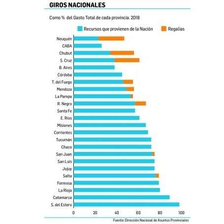 Y también se destacan las provincias que tienen en las regalías a un recurso relativamente importante y, también, un recurso que no tiene costo político: Neuquén (24 % de su gasto se financia con regalías), Chubut (22 %), Santa Cruz (23 %), Mendoza (7%), T. del Fuego (9%) y Rio Negro (10%).