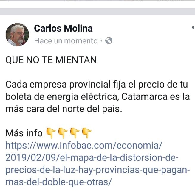 “Que no te mientan” puso Molina en su Facebook cuando presenta la nota de INFOBAE, pero él tampoco dice la verdad, ni antes cuando debía aclarar su verdadera participación en la estafa millonaria a la Municipalidad, ni menos ahora, en este tema del precio de la energía, que es cara en todo el país por los precio que fija la Nación.