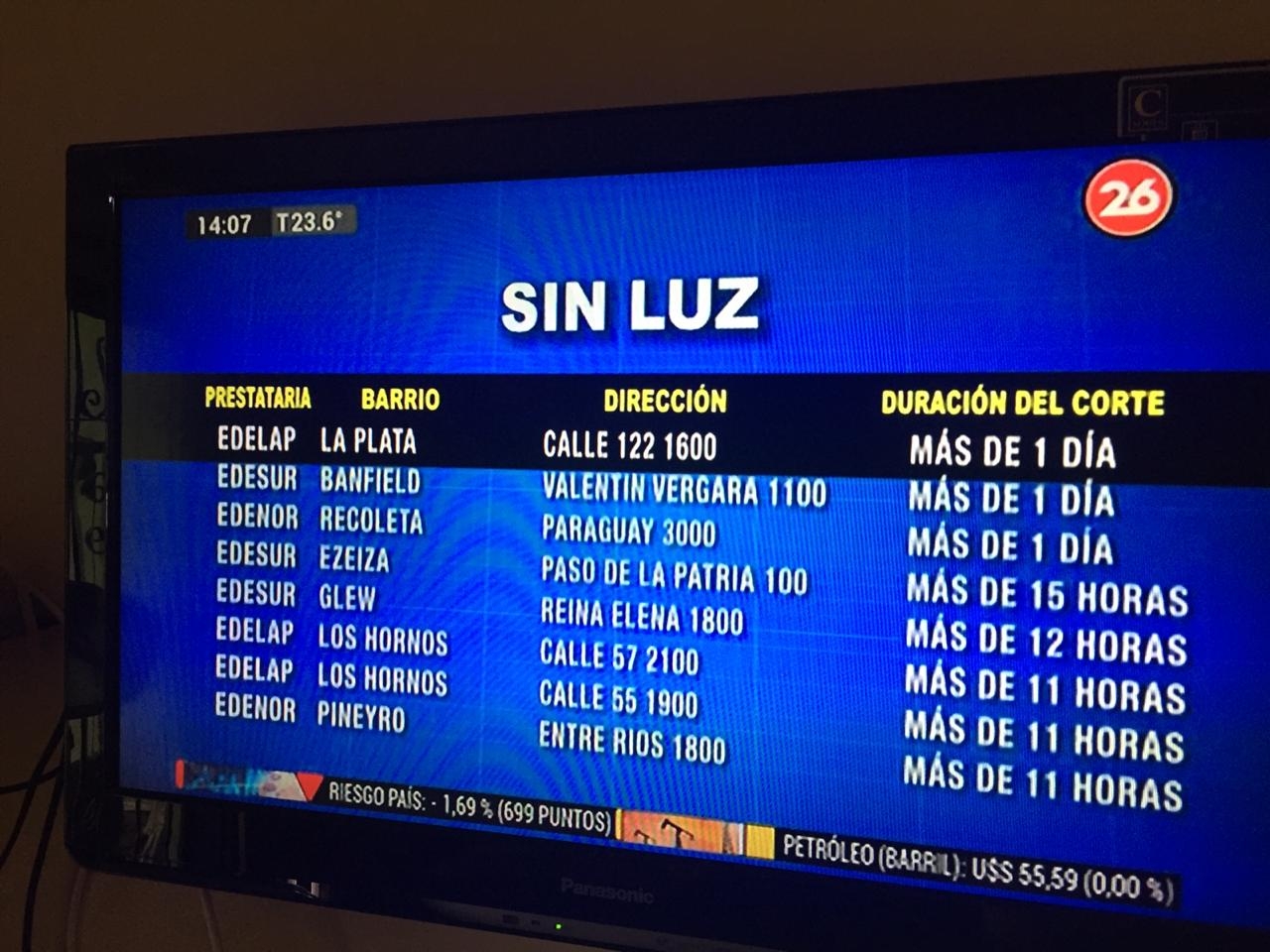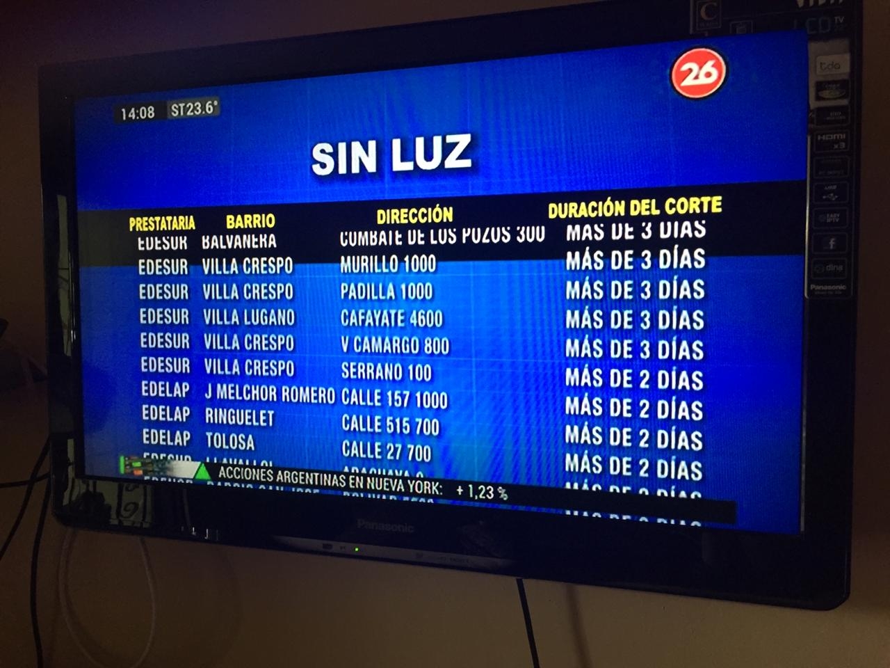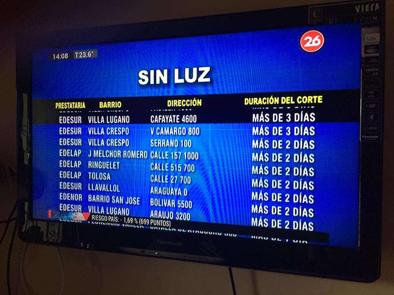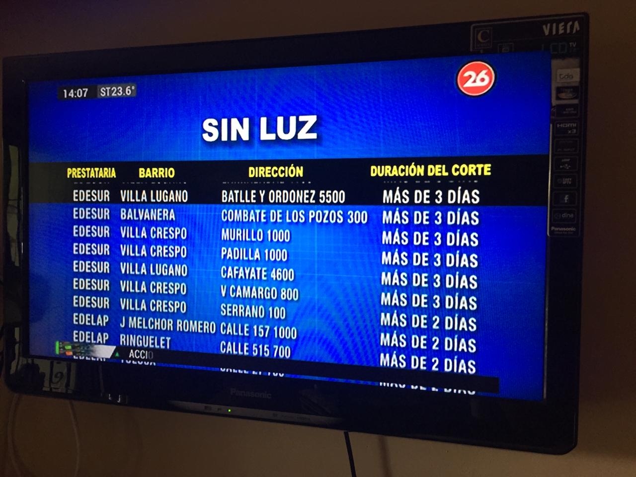 Según el informe, entre diciembre y enero pasado hubo cientos de miles de usuarios residentes de Villa Crespo, Villa Lugano, Balvanera , Florencio Varela, Núñez, Melchor Romero, La Plata, Banfield, Recoleta, Ezeiza, Glew, que por días completos sufrieron la falta del servicio eléctrico. Ver fotos adjuntas.