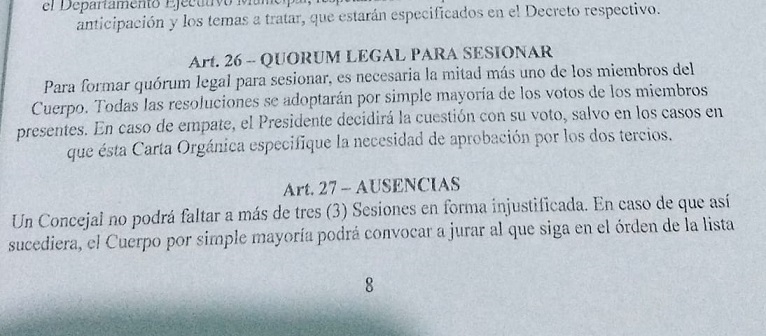 En el año 2000, el Concejo Deliberante de Recreo, asumiendo la facultad que le es propia, mediante Ordenanza, Reglamentó el Artículo 26 de la COM, y acordaron los Concejales de esa época, que el COURUM Legal, sobre 5 Concejales, es de 3 Concejales.
