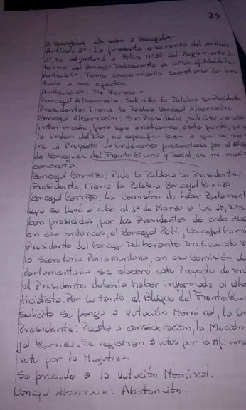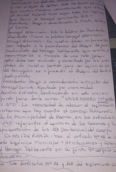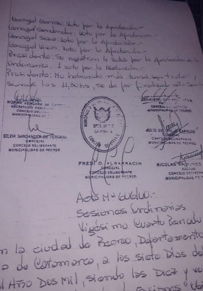El Concejo Deliberante estaba presidido por Gelasio "Chacho" Vivas y el Proyecto de Ordenanza fue aprobado por los votos afirmativos de los Concejales Silvia Santander, Julio "Cacho" Carrizo, Aníbal Sosa y también votó por la afirmativa el Presidente Vivas, según el Acta correspondiente. El Concejal Fredi Albarracín se "abstuvo" de votar. Resultado: 4 votos afirmativos y 1 abstención, sobre un total de 5 Concejales.