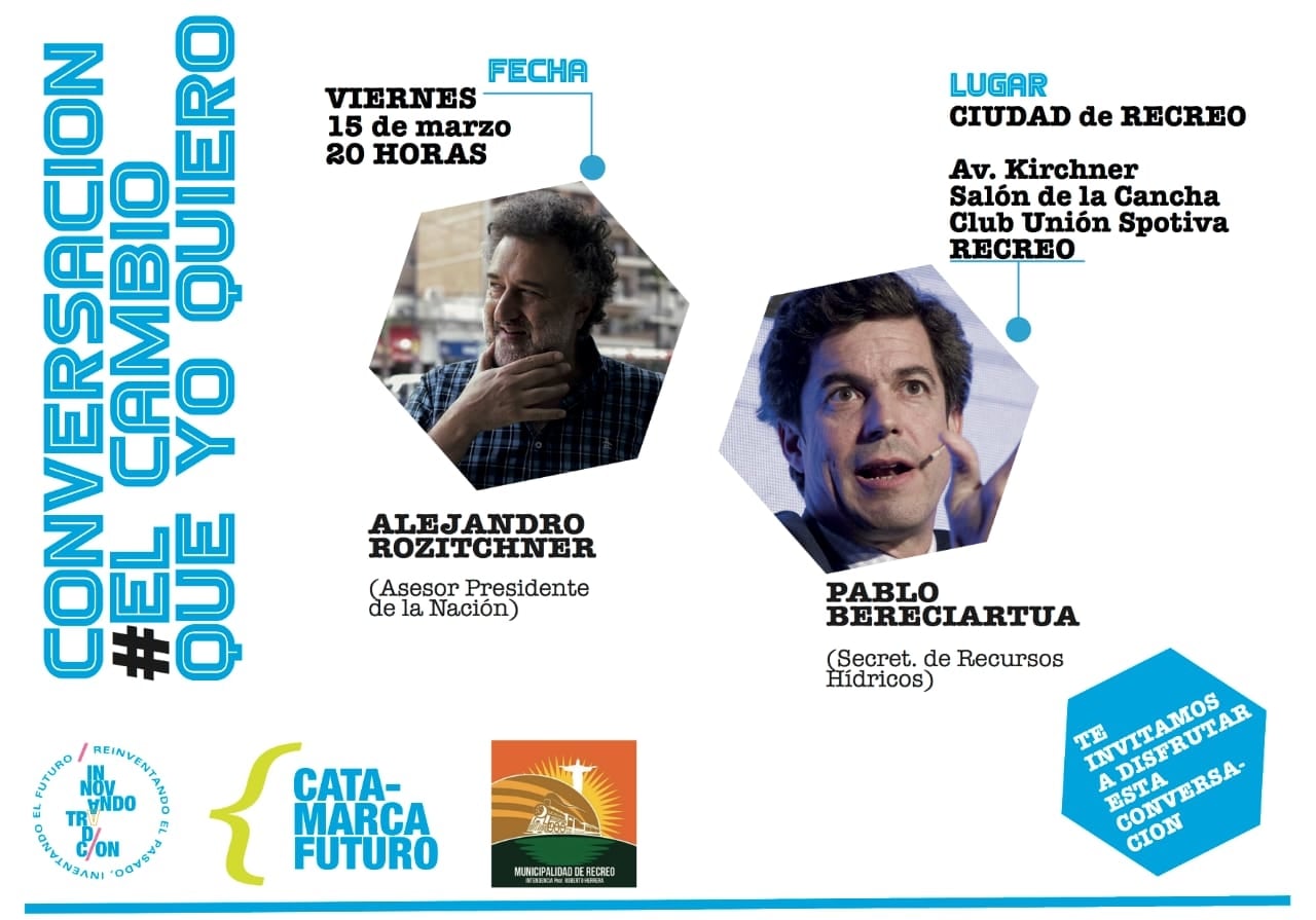 Bajo el lema "El Cambio Que Yo Quiero", Pablo Bereciartua, secretario de Recursos Hídricos y el asesor del presidente de la Nación, Alejandro Rozitchner, buscan participarán de una charla con los vecinos de Recreo que se muestren interesados en aportar sus inquietudes y perspectivas para mejorar el departamento.