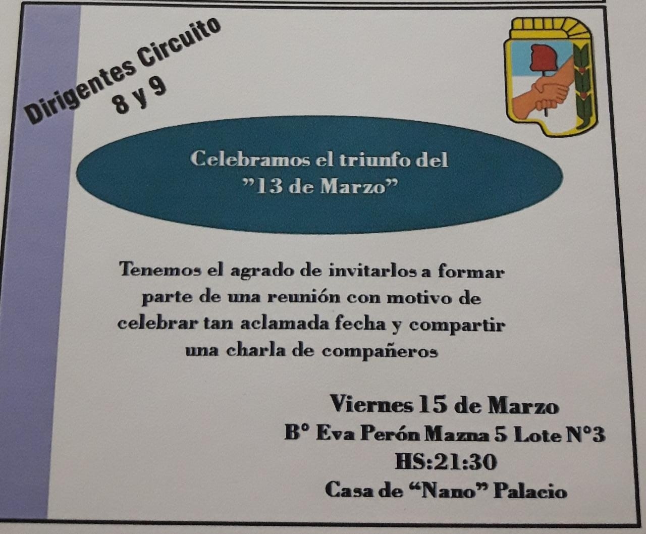 La reunión se realizará en la casa del dirigente “Nano” Palacio en la Manzana 5 del lote N°3 del barrio Eva Perón.