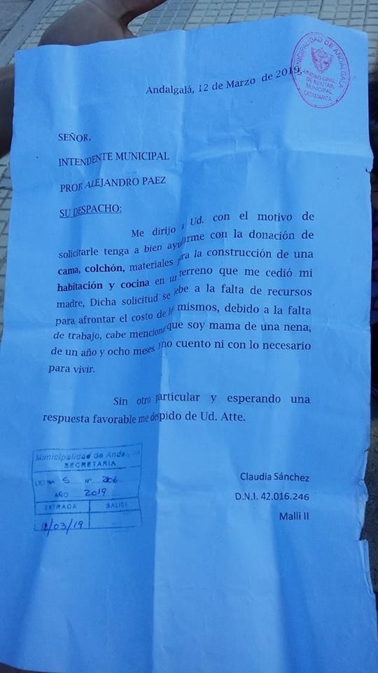 La joven, angustiada, manifestó que hace más de un mes que solicita ayuda al intendente de Andalgalá, Alejandro Páez, y al concejal José Luis Cativa, porque no tiene dónde vivir.