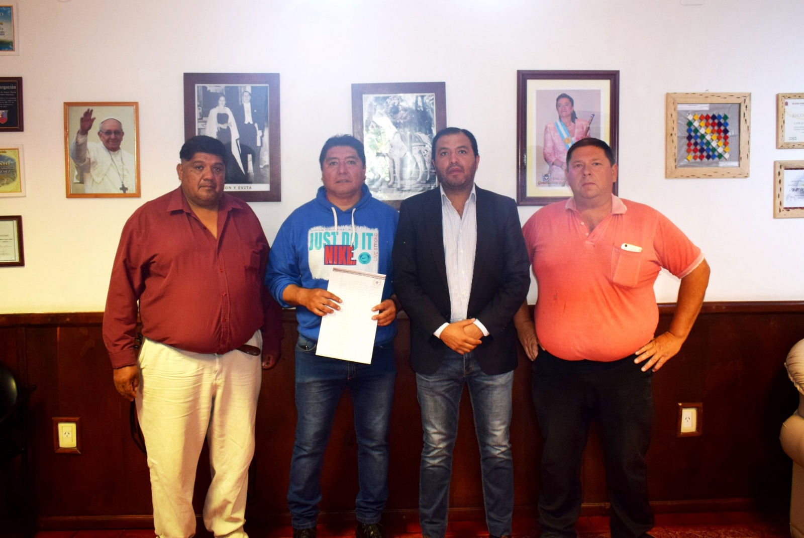En el día de hoy, el intendente, C.P.N Juan Pablo Sánchez, junto a la asesora legal del municipio Dra. Alicia Pastorelli, se reunió, en su despacho, con los representantes del gremio ATE, Juan Fuenzalida, secretario Gral., José Guerrero, y el representante del gremio UPCN, Marcelo Gómez para cerrar el monto y modalidad de pago del incremento salarial.
