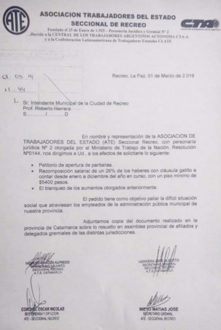 Los gremialistas consideraron que el reclamo se realizará frente a la Municipalidad de Recreo, según pedido de las bases.