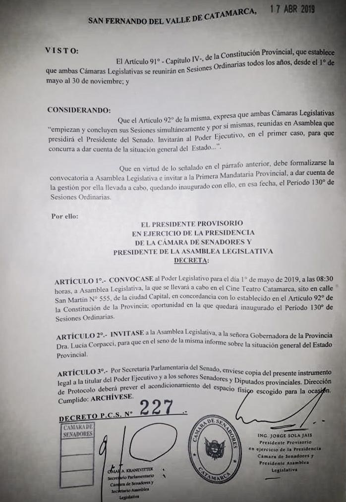 Mediante Decreto P.C.S. Nº 227 de fecha 17 de abril, el presidente provisorio en ejercicio de la presidencia de la Cámara de Senadores y Presidente de la Asamblea Legislativa Jorge Solá Jais, convoca a senadores y diputados provinciales, a la Asamblea Legislativa que se llevará a cabo el día miércoles 1º de mayo de 2019 a las 8.30 horas, con el propósito de dejar inaugurado el “Periodo 130º de Sesiones Ordinarias”.