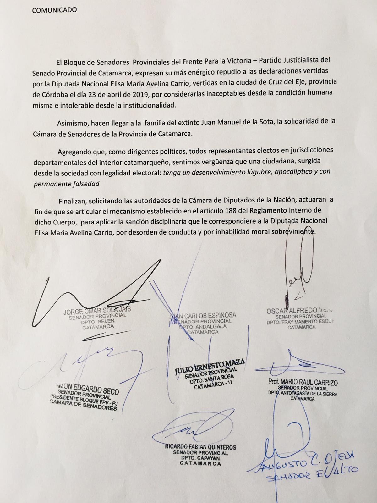 Finalizan, solicitando las autoridades de la Cámara de Diputados de la Nación, actuaran a fin de “articular el mecanismo establecido en el artículo 188 del Reglamento Interno de dicho cuerpo, para aplicar la sanción disciplinaria que le correspondiere a la diputada nacional Elisa María Avelina Carrio, por desorden de conducta y por inhabilidad moral sobreviniente”.