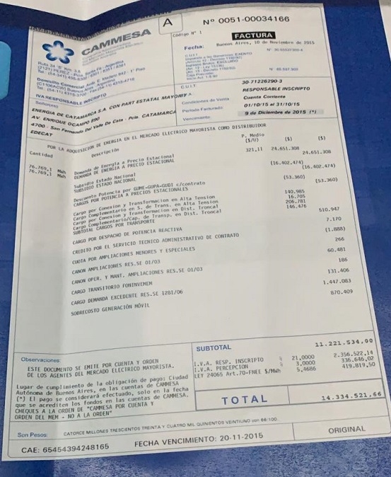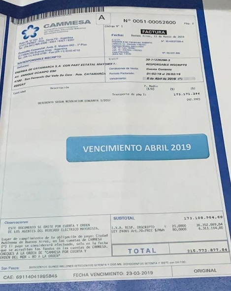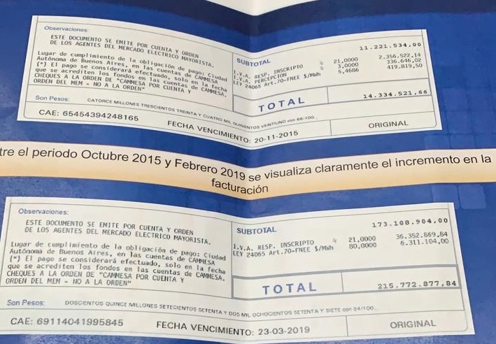 Entre diciembre 2015 y febrero 2019, el costo de la energía residencial aumentó un 1.800 %, porcentaje que elevó la facturación de CAMMESA a la EC SAPEM, de los $14.334.521,66 en diciembre de 2015 a los $215.772.877,84 de febrero de este año.