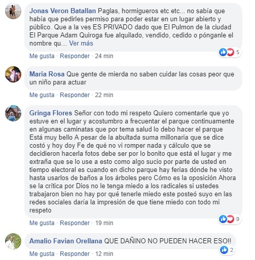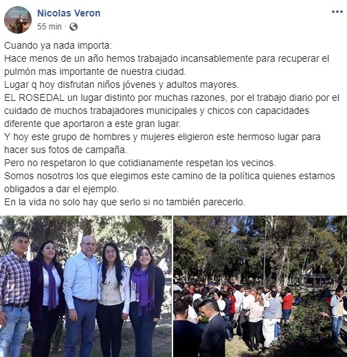 Sin embargo, el actual secretario de Ambiente de la Municipalidad de la Capital, Nicolás Verón, realizó un posteo en la red social Facebook y fue crítico por el estado en el que quedó el paseo tras un uso electoral del mismo. "En la vida no sólo hay que serlo, sino también parecerlo", escribió.