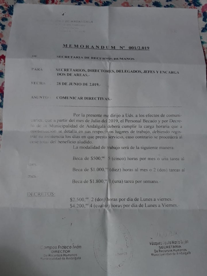 La directiva reza que el “personal becado y por decreto de la Municipalidad de Andalgalá deberá cumplir la carga horaria que a continuación se detalla en sus respectivos lugares de trabajo, debiendo registrar su asistencia los días en que presta servicio, caso contrario se procederá al cese total del beneficio aludido”.