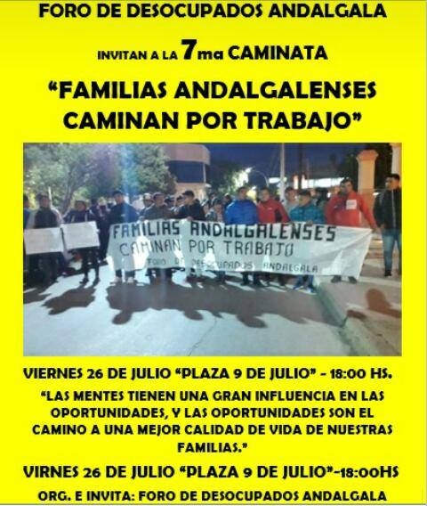 Lucas Ibarra, integrante del Foro de Desocupados Andalgalense, manifestó que “todos los meses hacemos una caminata, las anteriores mostraron una buena convocatoria y esta no será la excepción, hacemos la convocatoria en horas de la tarde porque mucha gente viene de los distritos, de Choya, Potrero, Villa Vil, Amanao y deben regresar a sus distritos antes de que caiga la noche debido a que las bajas temperaturas son más intensas en estos lugares”.