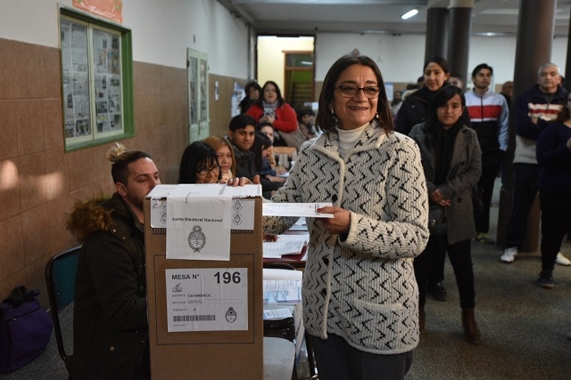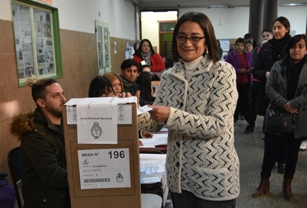 La mandataria concurrió a votar acompañada por el secretario de Seguridad, Marcos Denett, el jefe de la Policía de la Provincia, Orlando Quevedo; los ministros Ramón Figueroa Castellanos, Rubén Dusso y Guillermo Dalla Lasta.