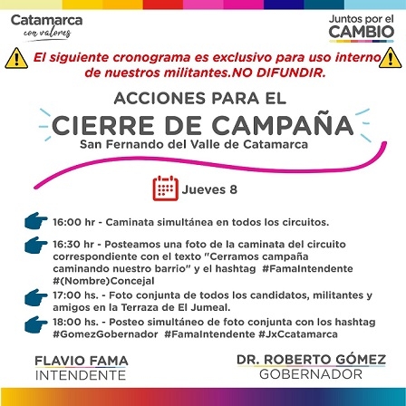 El frente Juntos por el Cambio tendrá a las 16 caminatas en simultáneo en todos los circuitos de la Capital, y a las 17 todos los candidatos y dirigentes, comandados por Roberto Gómez (Gobernador) y Flavio Fama (intendente de la Capital), se dirigirán a la zona conocida como Terraza de El Jumeal, donde se tomarán una foto conjunta, que luego será posteada en las diferentes redes sociales.
