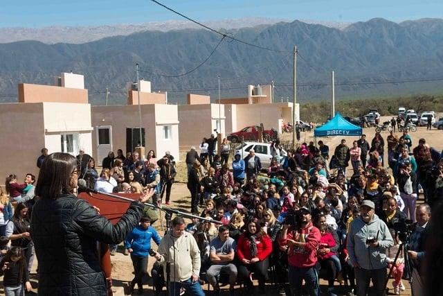 Construir viviendas, es darle respuestas a las demandas de miles de familias que no tenían casa propia. Y significa también generar puestos de trabajo. Por cada una que se construye entra a trabajar un obrero, ya sea electricista, albañil, plomero. Eso es importante, es comida, es posibilidad de desarrollarse para muchas familias. Aún en la situación difícil que estamos, construimos más viviendas con fondos provinciales. Le pregunté a Dante cuándo y él me dice que en octubre, y yo le dije: `tratemos de apurarlas un poquito´. Por lo pronto, acá van a ver a 350 personas trabajando en la construcción, haciendo las 350 viviendas que prometimos a los catamarqueños.