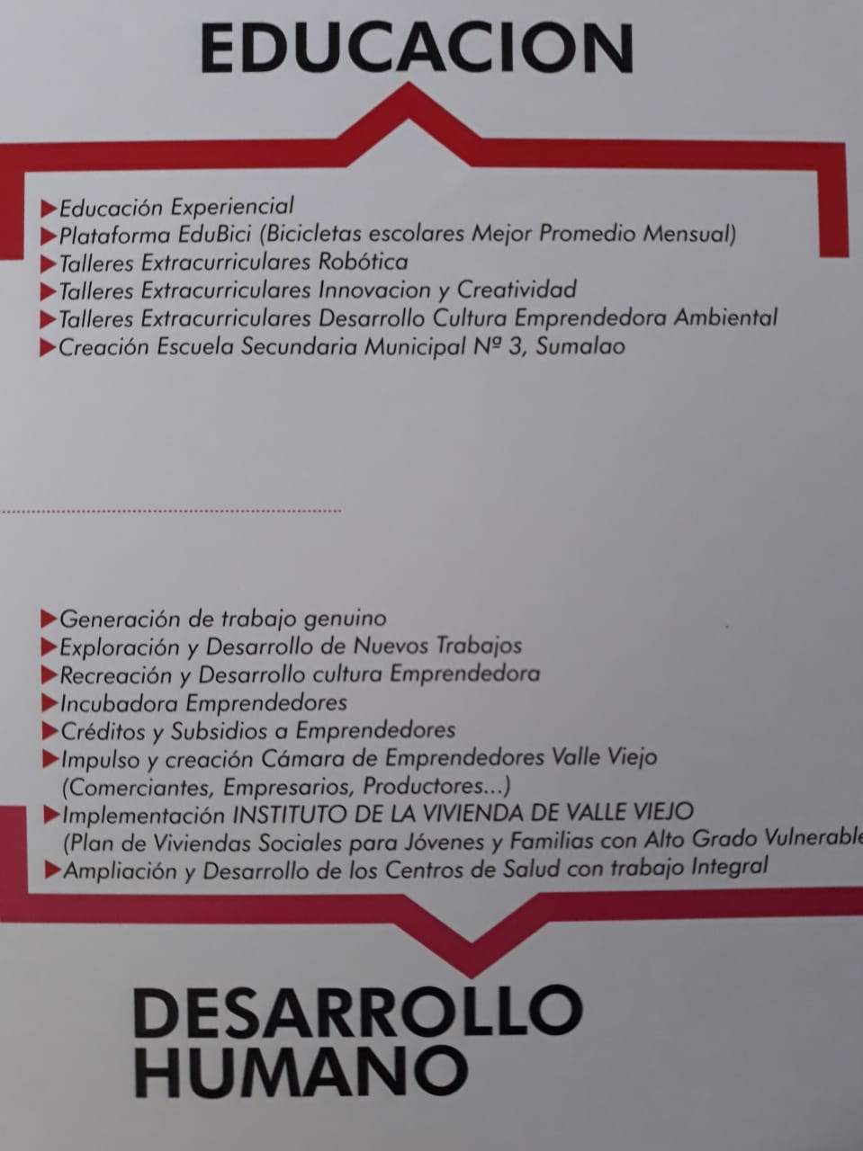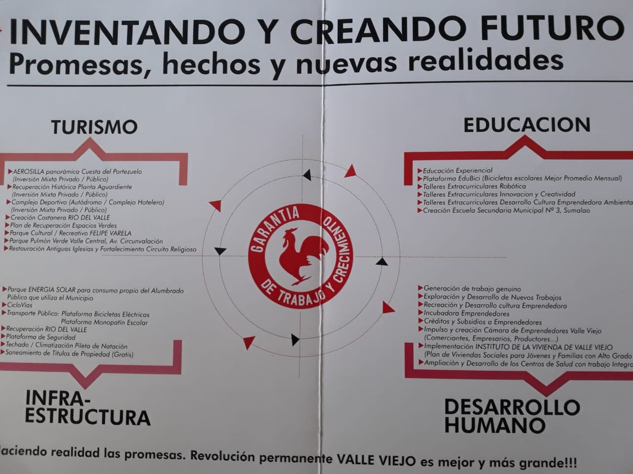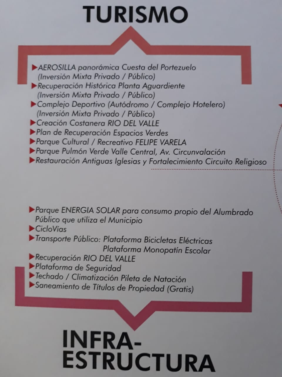 Los proyectos poseen obras en la esfera educativa, deportiva, turística, cultural y urbanística entre otros. Respecto al turismo, destacó la creación de la aerosilla en vista a Cuesta El Portezuelo, la creación de la costanera Valle Viejo y la recuperación del Parque Pulmón Verde Valle Central, como proyectos ambiciosos para despertar interés en la zona.