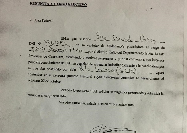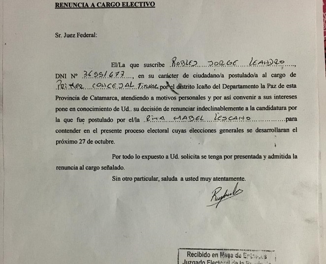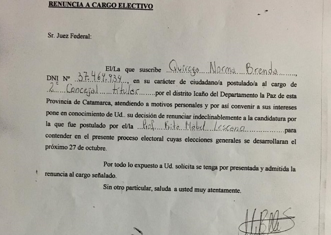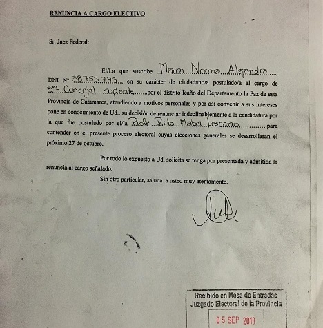 En las últimas horas se conoció que 4 de los 6 Candidatos a Concejales de la Lista del GEM de Rita Lescano, presentaron su RENUNCIA INDECLINABLE en el Juzgado Electoral de la provincia de Catamarca.