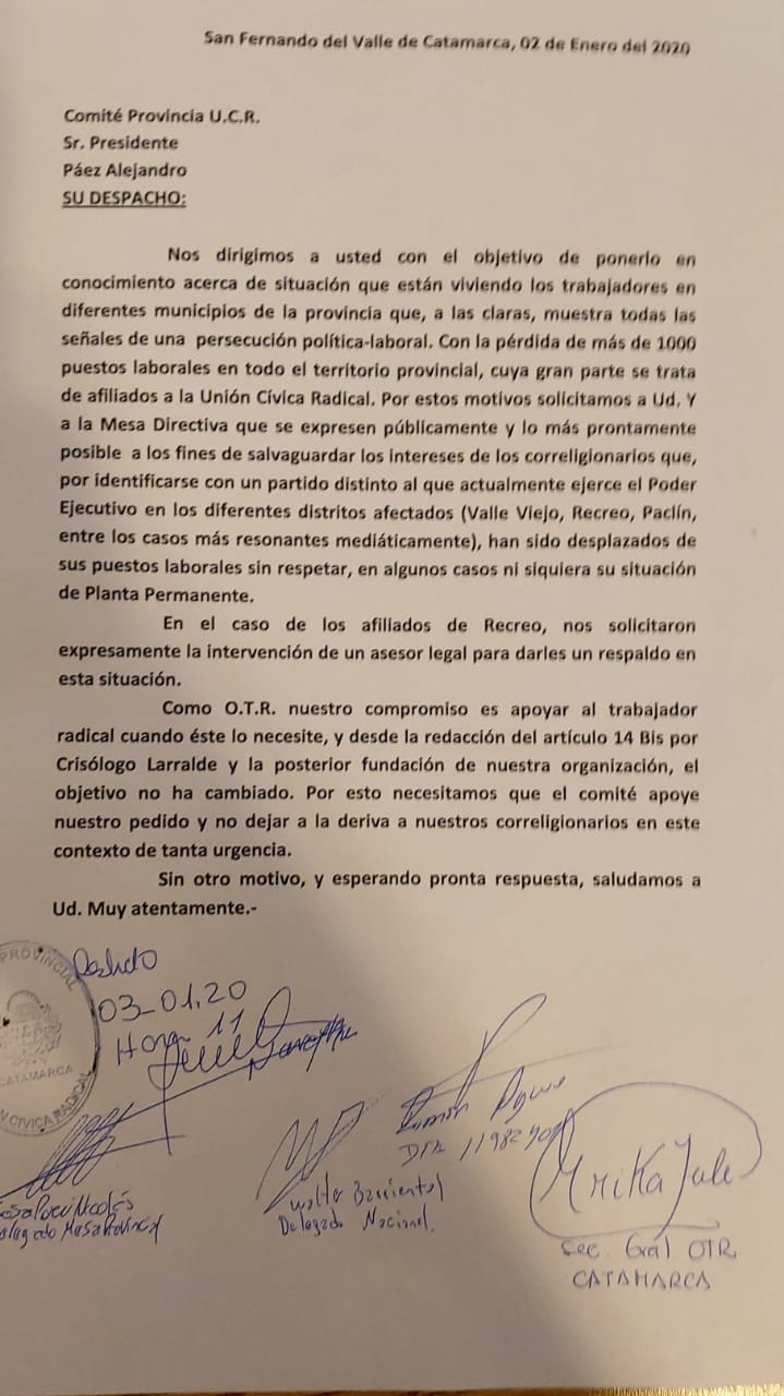 En la misiva, le exigen al presidente de la UCR, Alejandro Páez, que el partido intervenga con apoyo a las fuentes laborales de los municipales, entendiendo que se trata de una “persecución política” por banderas políticas.