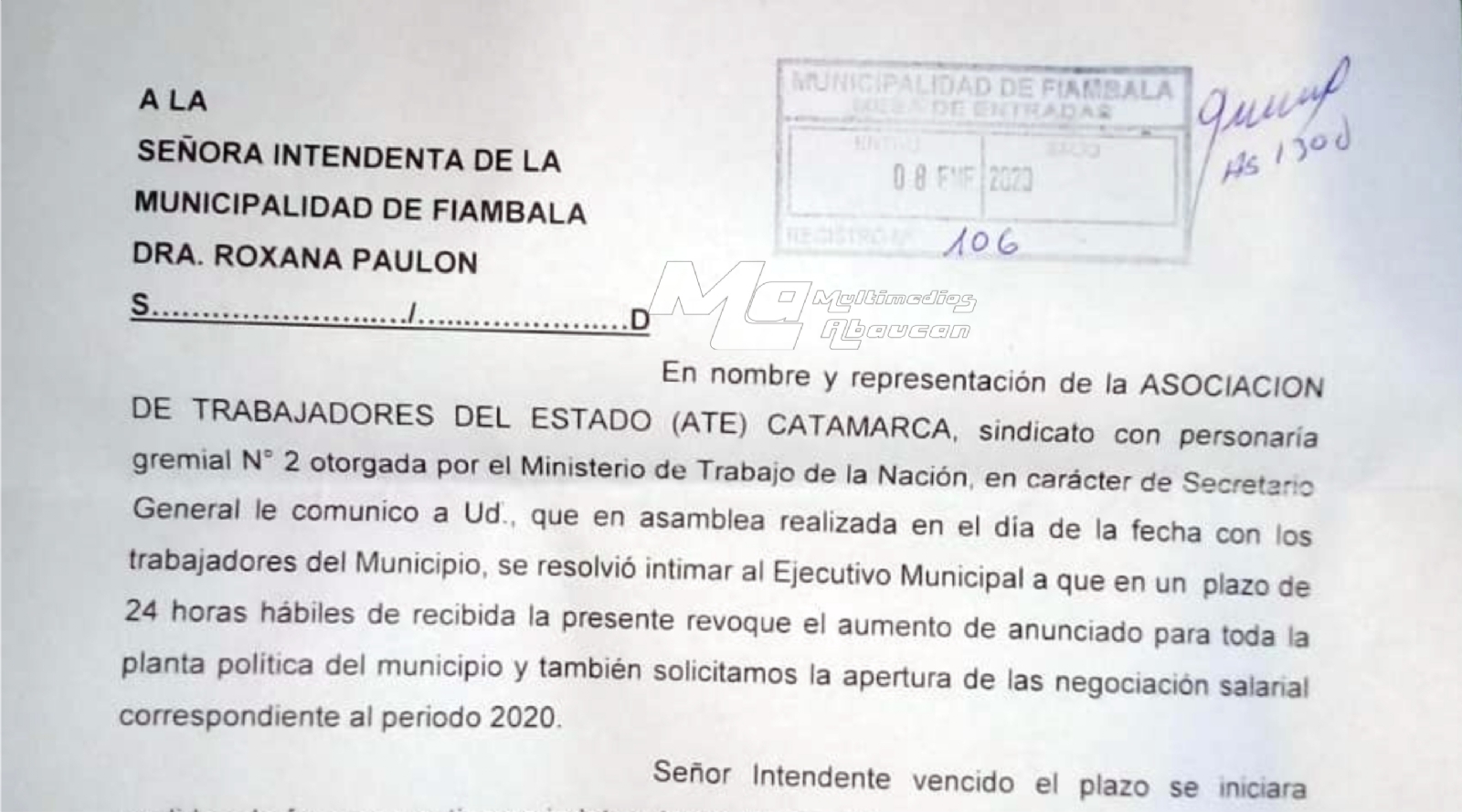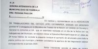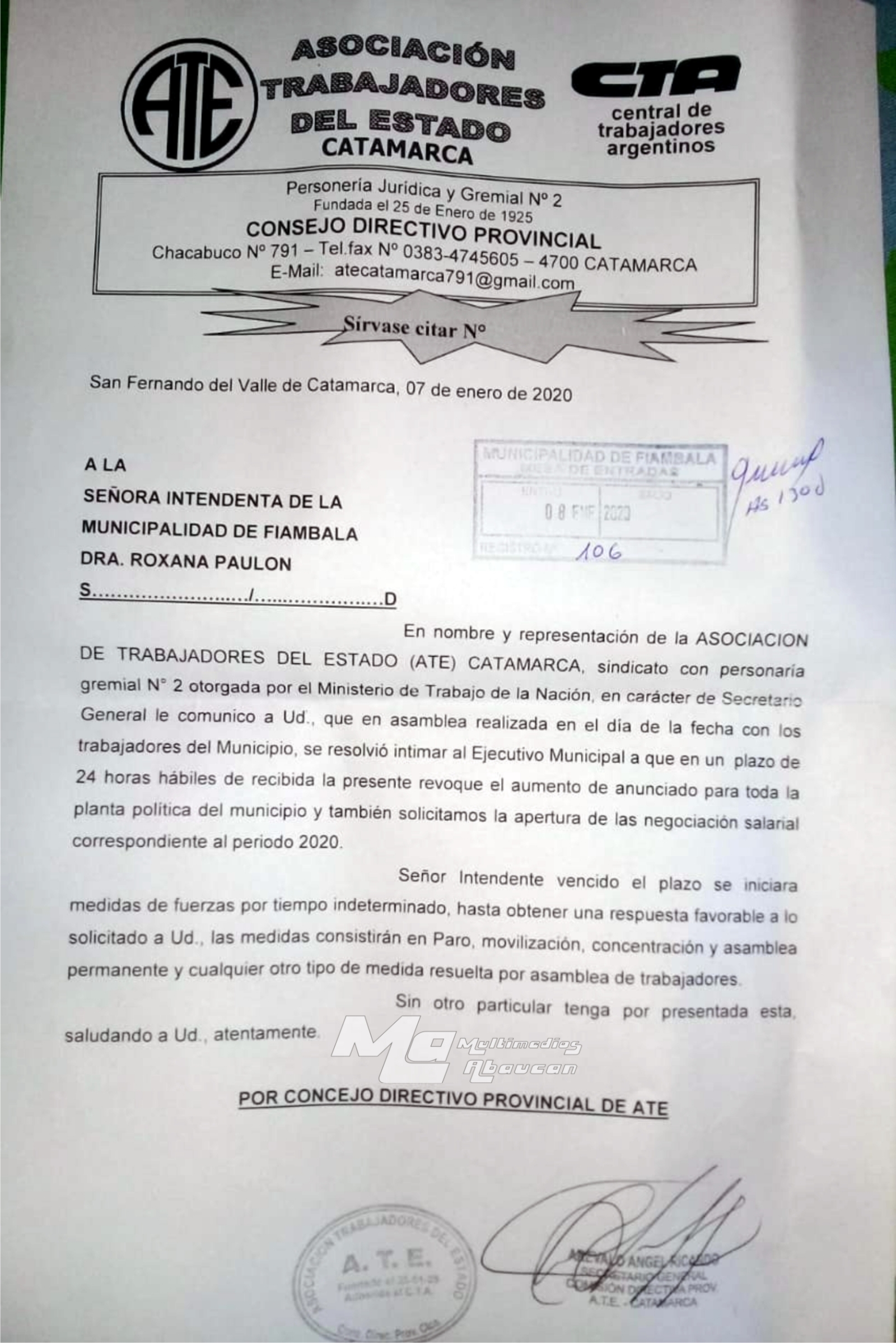 En nombre y representación de la ASOCIACIÓN DE TRABAJADORES DEL ESTADO (ATE) CATAMARCA, sindicato con personería gremial N° 2 otorgada por el Ministerio de Trabajo de la Nación, en carácter de Secretario General le comunico a Ud. que en asamblea realizada en el día de la fecha con los trabajadores del Municipio, se resolvió intimar al Ejecutivo Municipal a que en un plazo de 24 horas hábiles de recibida la presente revoque el aumento anunciado para la toda la planta política del municipio y también solicitamos la apertura de la negociación salarial correspondiente al periodo 2020.