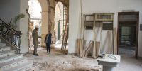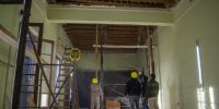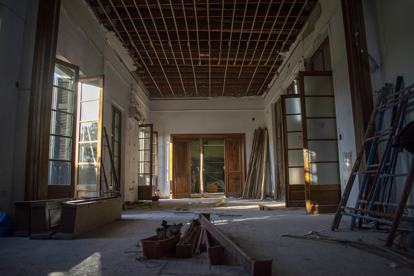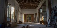 En la planta baja del ala Este, se retiraron los pisos para retornar al piso de madera que tenía la obra original de Caravati. De la misma manera, se retiran paredes adicionales y se verifican las estructuras. Mientras se avanza, también se recuperan los arcos originales de la casa.