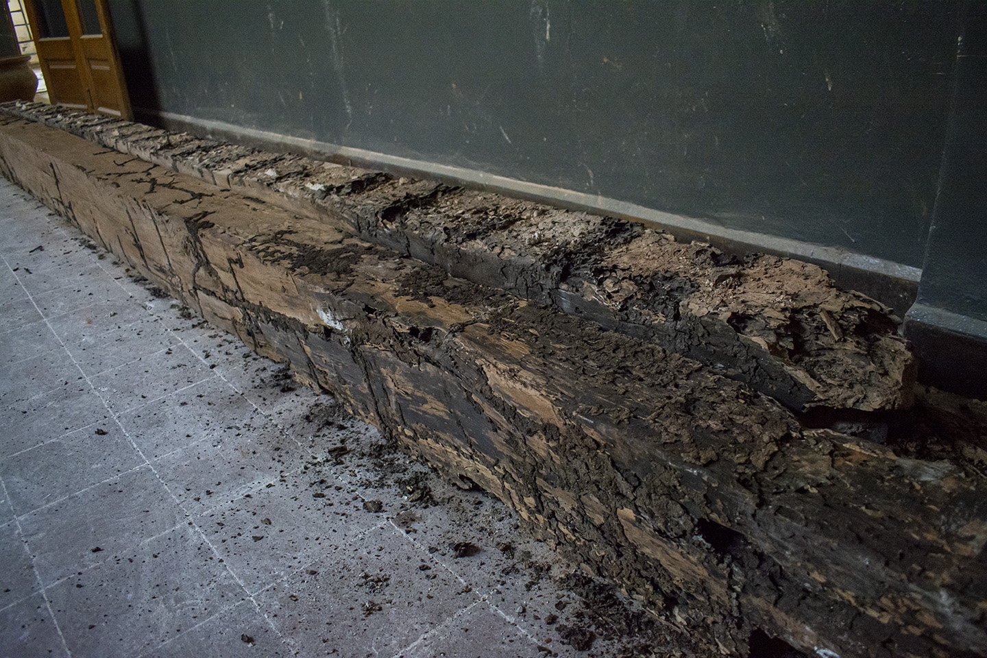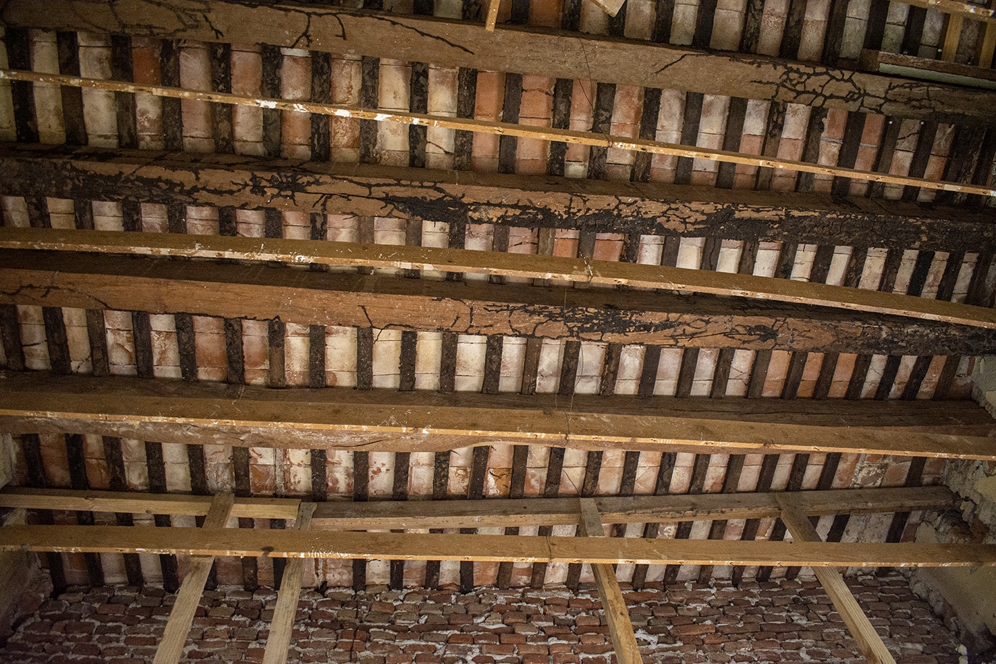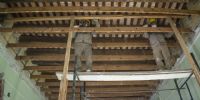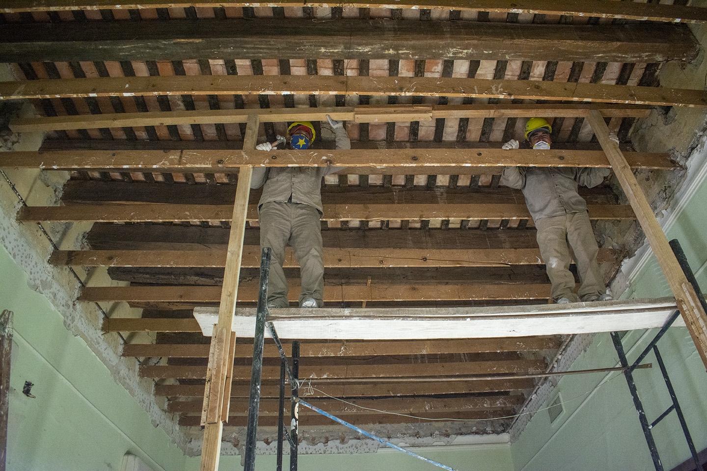 En ese sentido, la intervención comenzó por el ala Este del histórico edificio, donde en los techos de la planta alta se detectaron graves deterioros en las vigas de madera, con dos de ellas caídas y muchas otras completamente podridas, lo que comprometía la seguridad estructural del espacio. En consecuencia, se pusieron refuerzos de hierro.