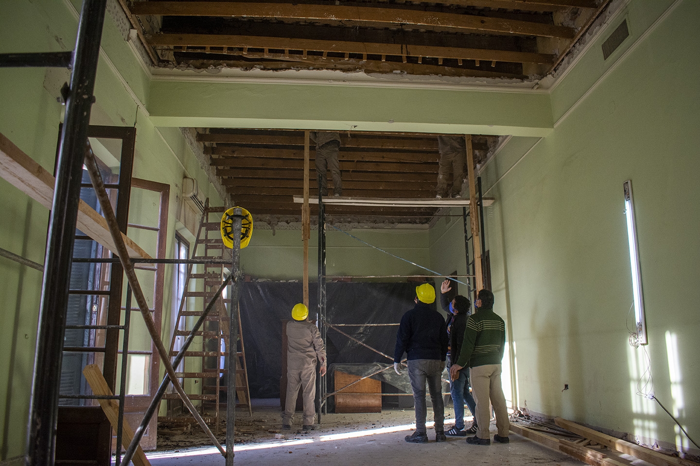 Misma acción se realizó en distintos puntos donde se detectaron fisuras en las paredes. Además, se avanza en la demolición de adicionales construidos en el transcurso de los años para crear nuevos espacios u oficinas. Asimismo, se intervendrá en los pisos de madera, ya que éstos datan de la estructura originaria.