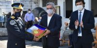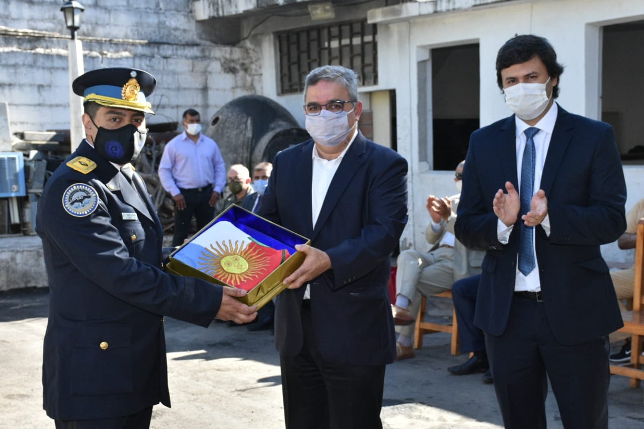 El primer mandatario provincial, junto al ministro, entregaron una placa recordatoria por este nuevo aniversario y una bandera protocolar a las autoridades de la delegación.