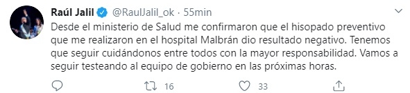 2 fotos 2 fotos viernes, 30 de octubre de 2020 23:28 viernes, 30 de octubre de 2020 23:28 No obstante, instó a la comunidad a mantener los cuidados. Jalil se había sometido al test PCR luego de que la ministra de Salud, Claudia Palladino, fue diagnosticada con coronavirus. Galería de fotos