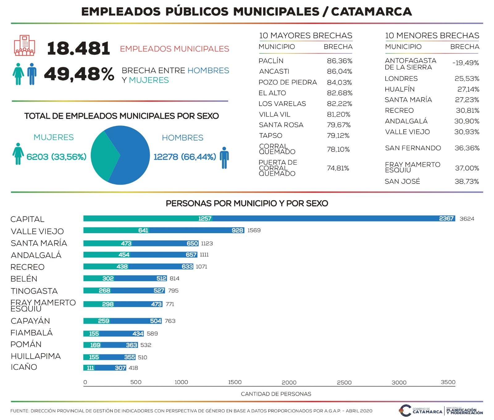 Un informe realizado por la Dirección Provincial de Gestión de Indicadores con Perspectiva de Género del Ministerio de Planificación y Modernización, sobre datos proporcionados por Administración General de Asuntos Previsionales (AGAP) de abril 2020, revela que del total de 18.481empleados municipales de la provincia, la brecha entre hombres y mujeres es de 49,48%.