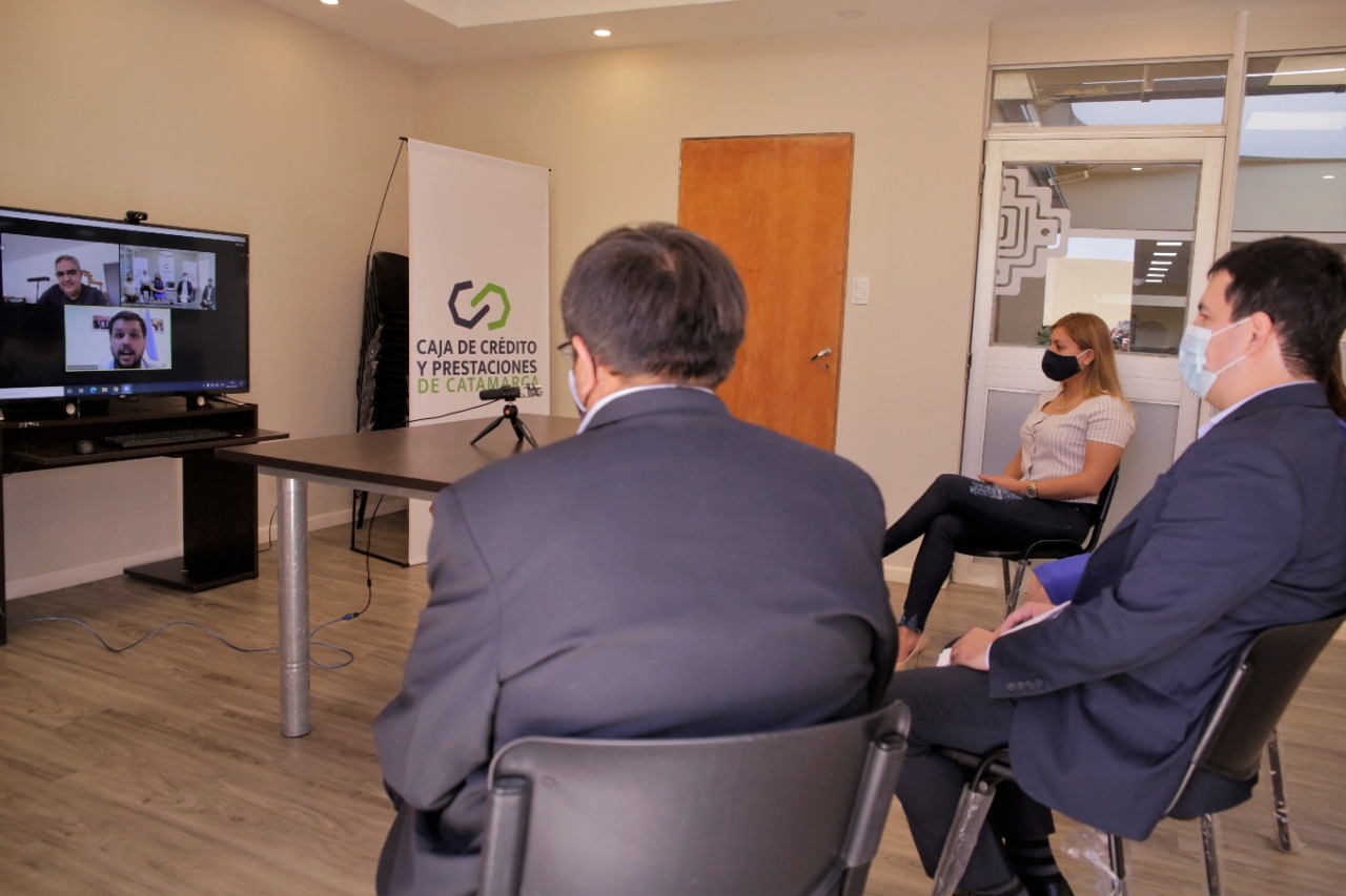 Durante la videoconferencia, el Gobernador Raúl Jalil destacó la importancia de los créditos que viene otorgando la Caja a distintos sectores, entre ellos, el financiamiento a laboratorios médicos y/o bioquímicos locales que realizan inversiones en equipamiento en el marco de la emergencia sanitaria por COVID-19.