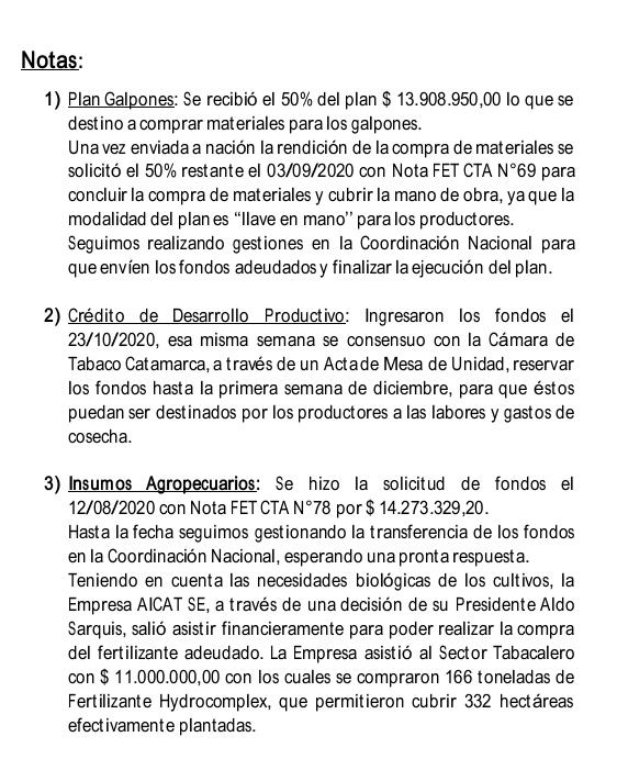 En cuanto a los fondos para estos insumos adeudados por el FET a Catamarca, los mismos fueron solicitados por nota el 12 de junio pasado y son por un total de $ 14.273.329,20. “Hasta la fecha seguimos gestionando en la Coordinación Nacional, y esperando una pronta respuesta. El adelanto que hizo AICAT fue para cubrir la necesidad biológica, urgente, de iniciar la campaña ya que si el productor no contaba con los insumos se iba a pasar el momento y después no iba a ser posible plantar; los productores agradecieron esta gestión”, recalcó el secretario.