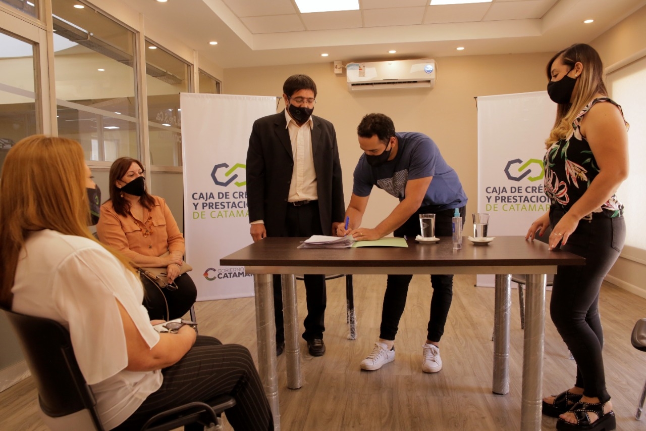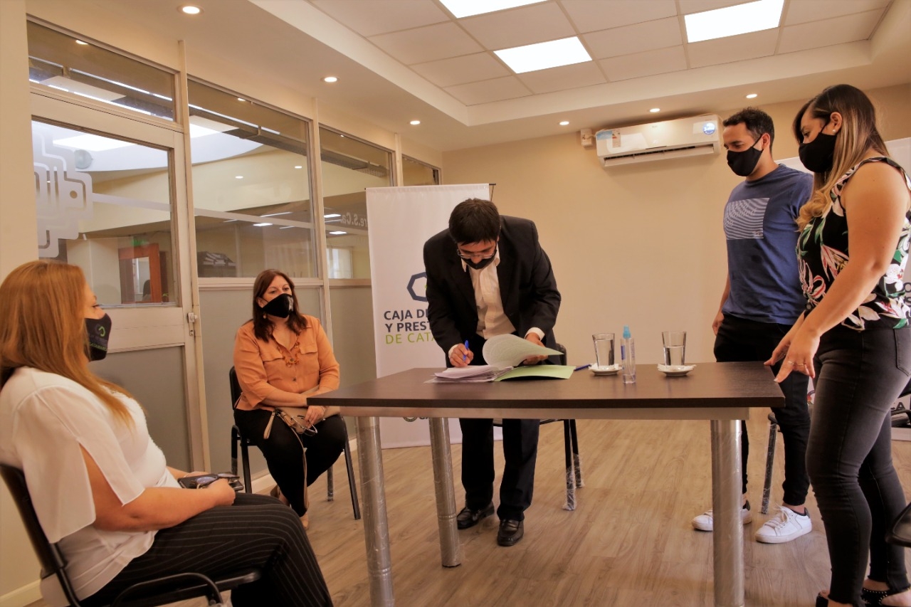 De la firma del crédito estuvieron presentes los primeros beneficiarios Pamela Bravo y Alejandro Acevedo, matrimonio docente de Valle Viejo que comienzan a cumplir el sueño de la casa propia. También estuvieron presentes los integrantes de la Caja de Crédito, su presidente Rafael Ponzo y los directores Stella Nieva y Daniel Zelarayán, y la titular de la AGAP, Hilda Plaza.