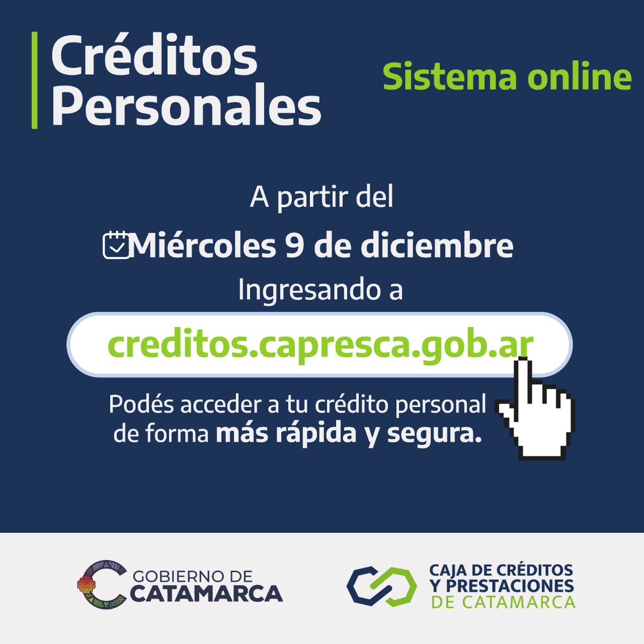 La Caja Crédito y Prestaciones de Catamarca anunció que se podrá acceder al crédito personal de forma más rápida y segura ingresando a creditos.capresca.gob.ar.