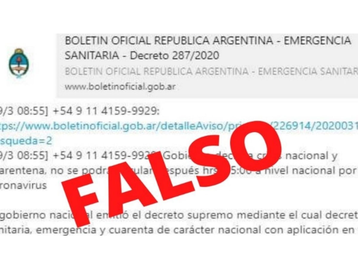 Se trata de un falso decreto del Poder Ejecutivo, que decía haber sido publicado en el Boletín Oficial y disponía una cuarentena desde el lunes por el coronavirus.