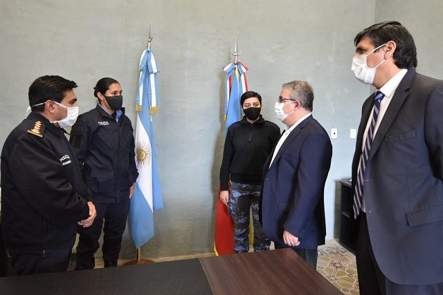 El gobernador Jalil y el ministro de Seguridad recibieron al jefe de Policía, Daniel Caliva, y a las dos agentes Brenda Pihuala y Julisa Aimé Nieto, quienes se destacaron en la promoción de la Escuela de Suboficiales, para felicitarlas por su egreso y dialogar sobre sus nuevas tareas.
