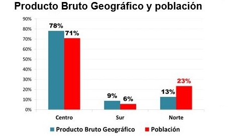 - En el sur se produce el 9% del PBI y allí vive el 6% de la población.