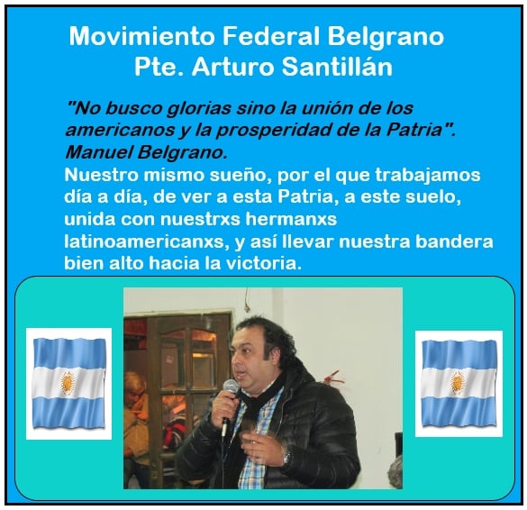 El Movimiento Federal Belgrano, comandado por su presidente Arturo Santillán, enaltece la figura del General Manuel Belgrano, al cumplirse un nuevo aniversario de su fallecimiento y por celebrarse el Día de la Bandera.
