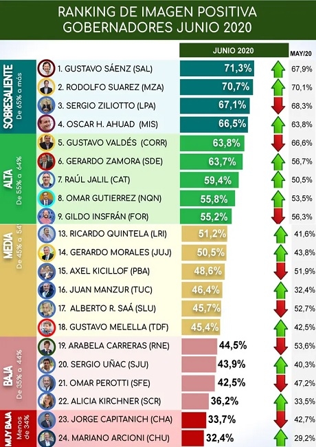 Los gobernadores Gustavo Sáenz (Salta), Rodolfo Suárez (Mendoza), Sergio Ziliotto (La Pampa) y Oscar Herrera Ahuad (Misiones) tienen algo en común: son los mandatarios con mejor imagen del país. Del otro lado de la tabla, con imagen "muy baja" o "baja" figuran Mariano Arcioni (Chubut), Jorge Capitanich (Chaco), Alicia Kirchner (Santa Cruz) y Omar Perotti (Santa Fe).