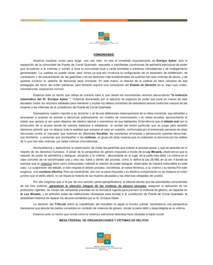 Por último, exigen, además de una sanción penal ejemplificadora, que las autoridades de los tres poderes garanticen la atención integral de las víctimas de abusos sexuales, aseguren la aplicación de los protocolos existentes, se inicien las campañas prevista en la normativa para prevenir la violencia de género, se capacite sobre la Ley Micaela, entre otros puntos.
