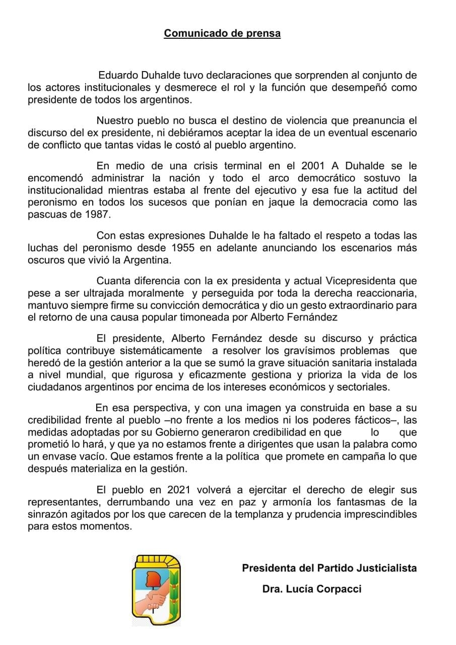 "nuestro pueblo no busca el destino de violencia que preanuncia el discurso del ex presidente, ni debiéramos aceptar la idea de un eventual escenario de conflicto que tantas vidas le costó al pueblo argentina", expresa en un párrafo el comunicado.