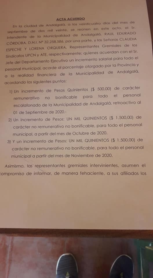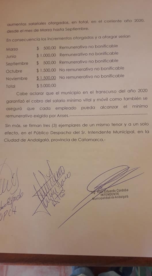 Los gremios de ATE y UPCN acordaron un incremento salarial de 3500 pesos, de manera que el sueldo bruto de un municipal andalgalense de categoría 10 rondará los 24 mil pesos.