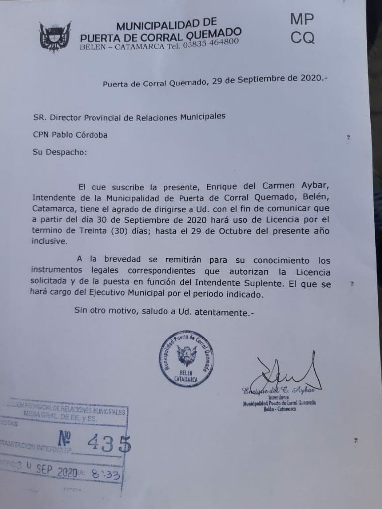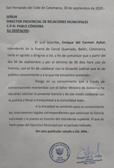 Cabe recordar que esta semana, distintos sectores de la Unión Cívica Radical, tanto partidarios como institucionales, firmaron un documento para remarcar en conjunto su desaprobación a que el intendente de Puerta de Corral Quemado (Belén), Enrique Aybar, continúe al cargo de la comuna.