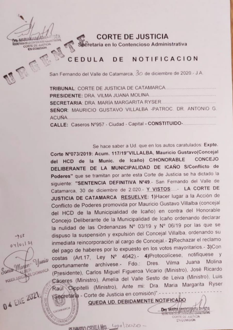 Recreo (C) - La Corte de Justicia de Catamarca, dictó este lunes sentencia definitiva, a favor de Gustavo Mauricio Villalba, Concejal del Concejo Deliberante de Icaño, que fuera "suspendido y expulsado del Cuerpo" el 16 de mayo de 2019.