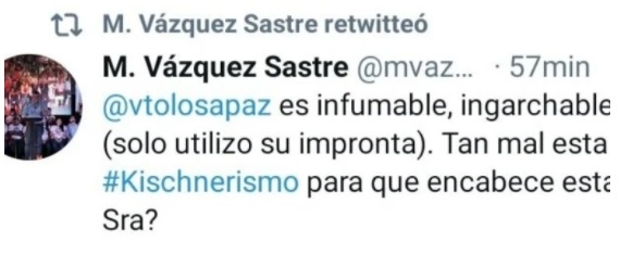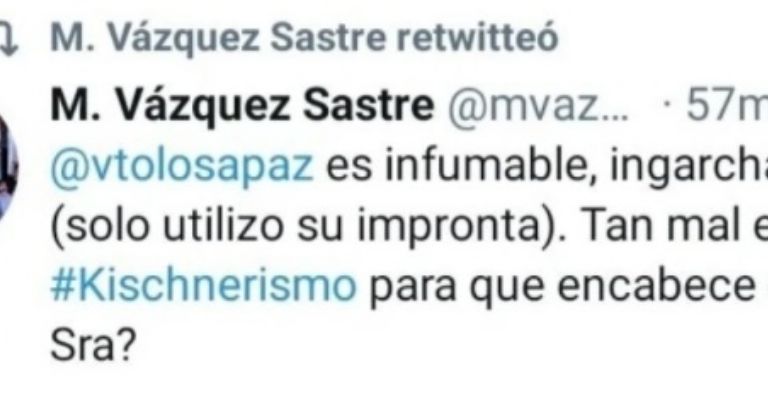 En medio del debate público que llevaban a cabo distintos candidatos bonaerenses en la televisión nacional, Vazquez Sastre publicó un Twett desacreditando y descalificando a Tolosa Paz. La trato de "infumable" y de "ingarchable".