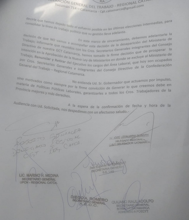 La misiva está firmada por los dos integrantes de la conducción de la CGT local, Leonardo Burgos y Roberto González, entre otros.
