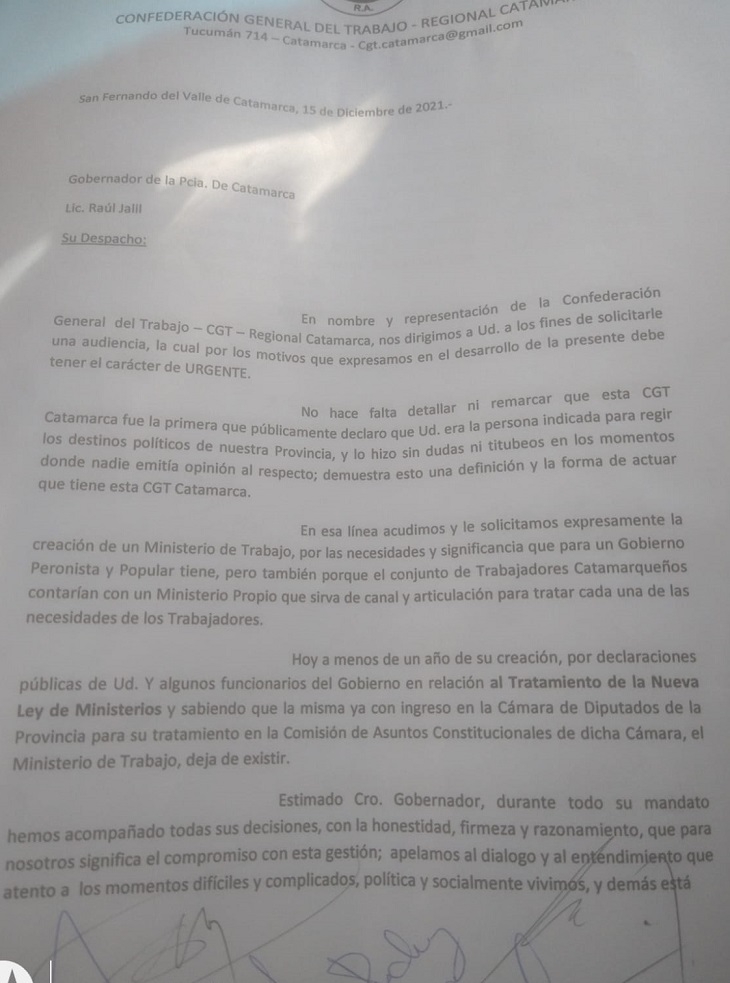 En la nota, la central obrera recuerda que fue uno de los principales actores que impulsó la candidatura de Raúl Jalil a Gobernador de Catamarca; y ya siendo mandatario "hemos acompañado todas sus decisiones, con la honestidad, firmeza y razonamiento que para nosotros significa el compromiso con esta gestión".