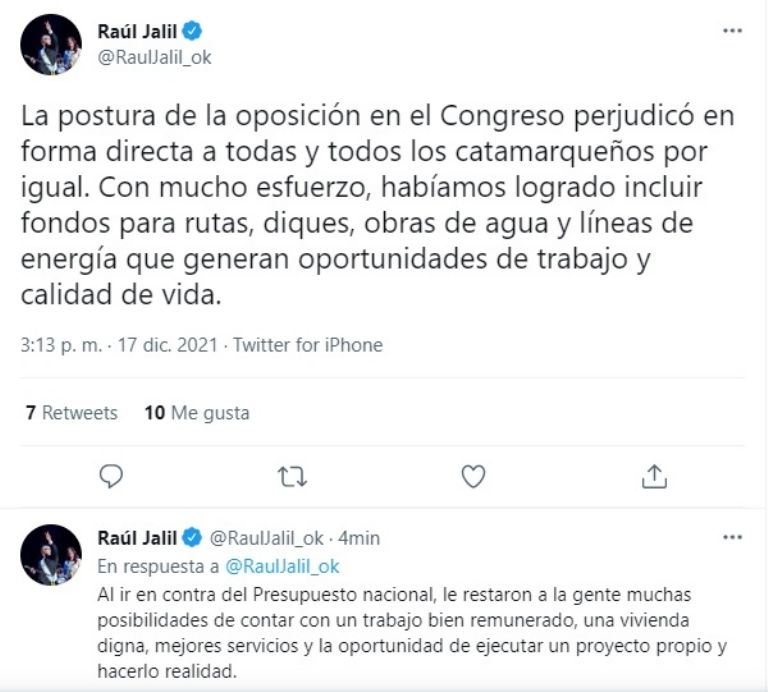 “La postura de la oposición en el Congreso perjudicó en forma directa a todas y todos los catamarqueños por igual. Con mucho esfuerzo, habíamos logrado incluir fondos para rutas, diques, obras de agua y líneas de energía que generan oportunidades de trabajo y calidad de vida”, publicó Jalil en Twitter.