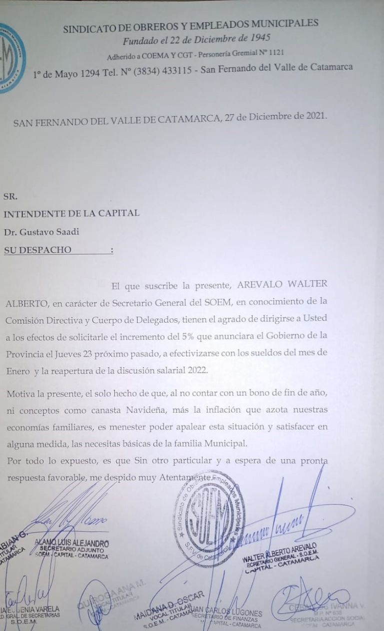 El incremento salarial que exigen a las autoridades municipales es del 5 por ciento a pagar en enero del 2022, como así también piden comenzar la discusión salarial para el próximo año.